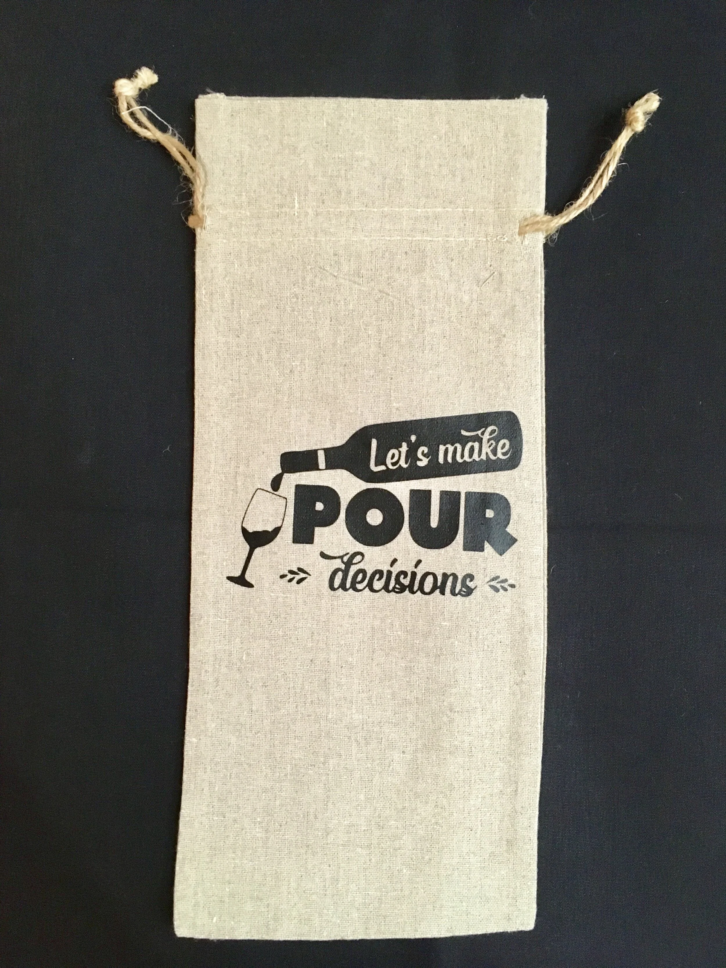 Let’s Make Pour Decisions Wine Bag Cotton-Jute Wine Bags with Natural Jute Drawstrings.
