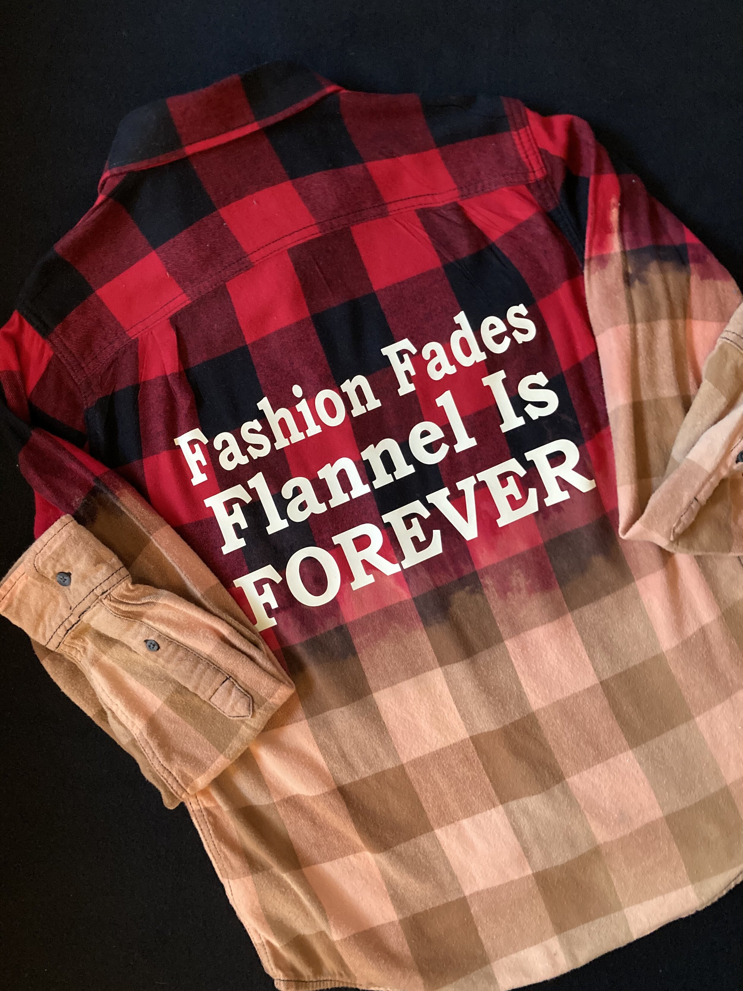 This item is for a one-of-a-kind bleached "Fashion Fades Flannel Is Forever Distressed" flannel shirt.