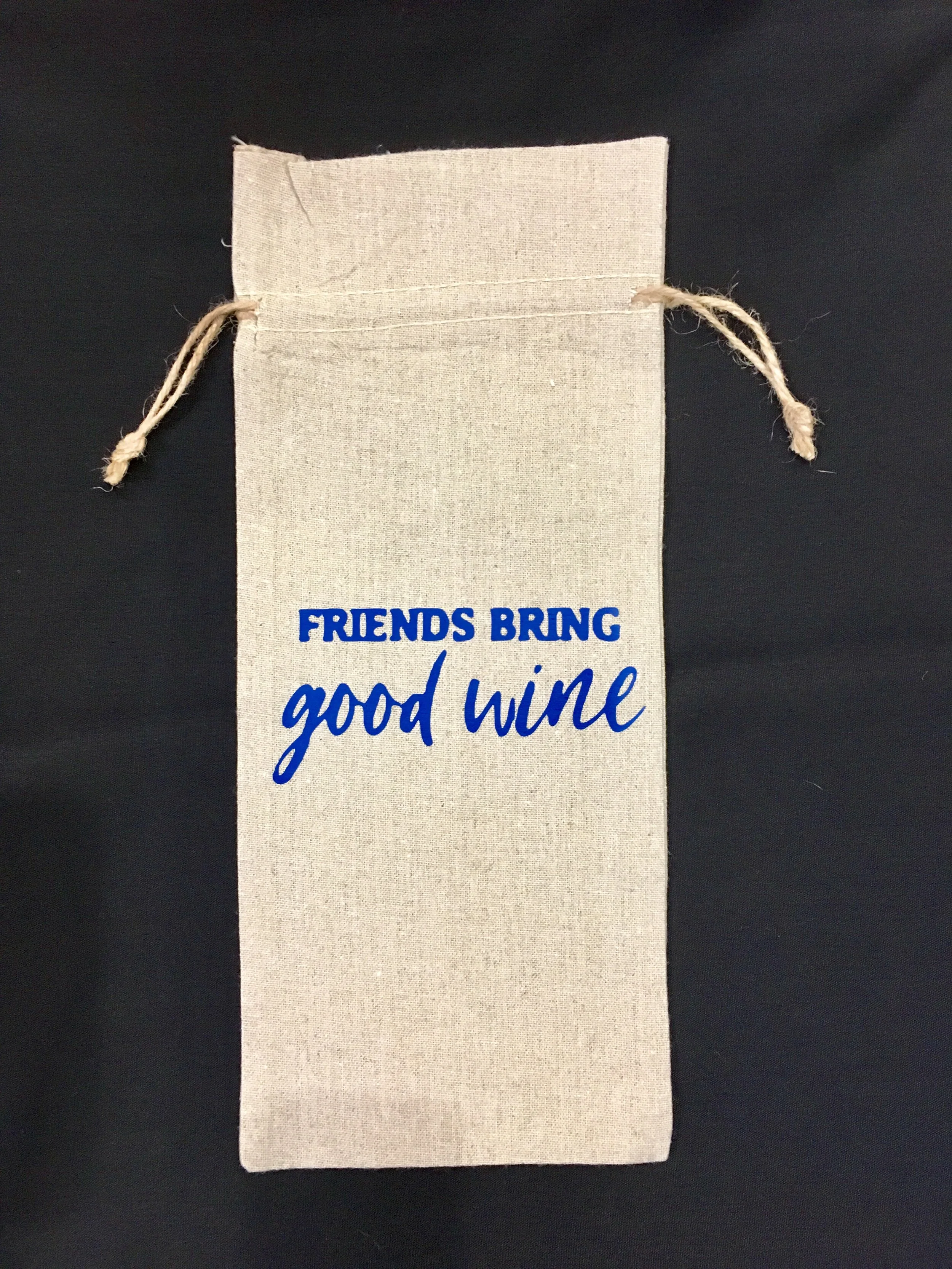 Friends Bring Good Wine Cotton-Jute Wine Bags with Natural Jute Drawstrings.
