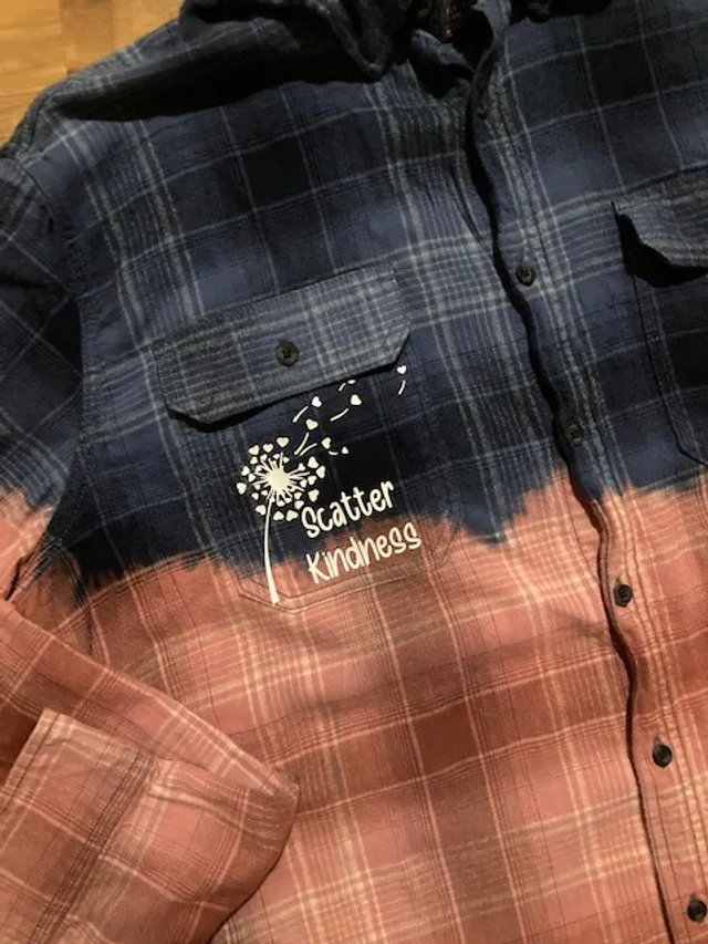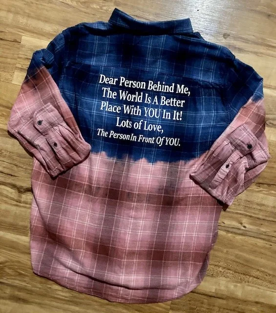 One-of-a-kind bleached "Dear Person Behind Me, The World Is A Better Place With You In It! Lots of Love, The Person In Front Of You" inspirational, high quality, affordable button down, two pocket distressed flannel shirt. Also, “Spread Kindness” is displayed on the front pocket.