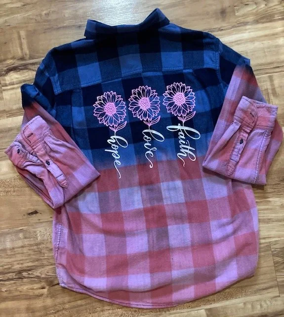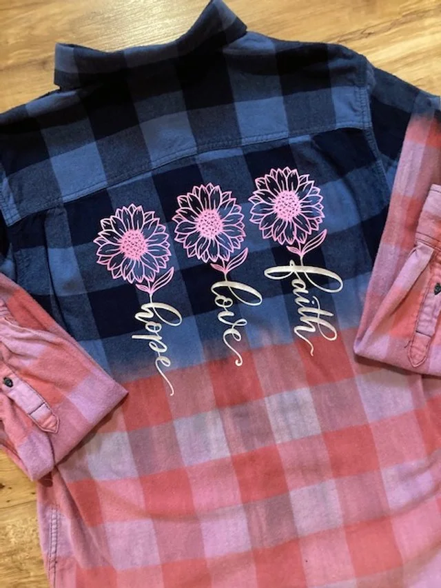 One-of-a-kind distressed bleached "Hope, Love Faith Three Daisy Flowers" inspirational, high quality, affordable button down, two pocket vintage flannel shirt. The Blue distressed flannel is perfect for October for Breast Cancer month with the pink daisies! A perfect gift for anyone, including you!