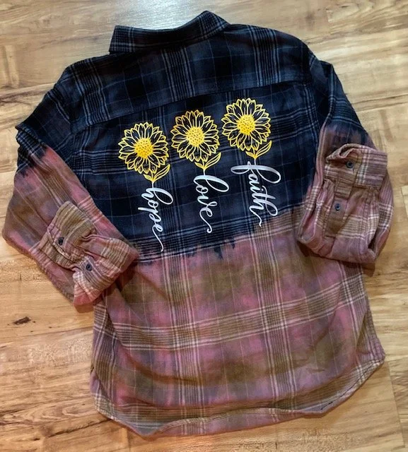 Daisies with Stems Hope Love Faith Distressed Flannel Shirt | Mystery Color Hand-Dyed Flannel Inspirational Faith Shirt