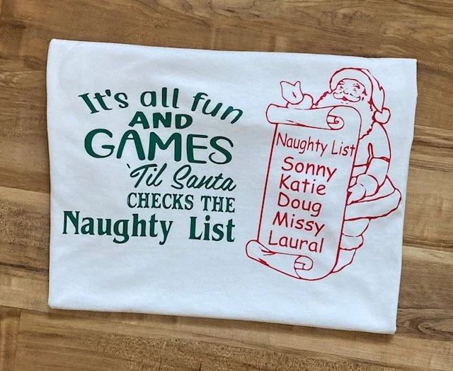 Shop this custom, personalized, comfortable, causal, holiday 'It’s All Fun and Games ‘Til Santa Checks the Naughty List” T-Shirt, available in gray or white t-shirts. You can add six (6) names to the Naughty List. Perfect shirt to wear at your family holiday gathering or your office party! This t-shirt will become one of your favorites quickly!