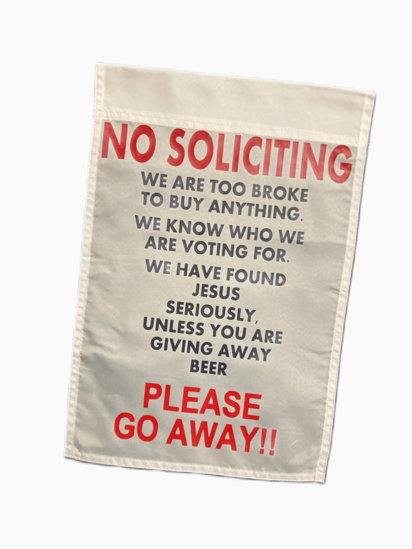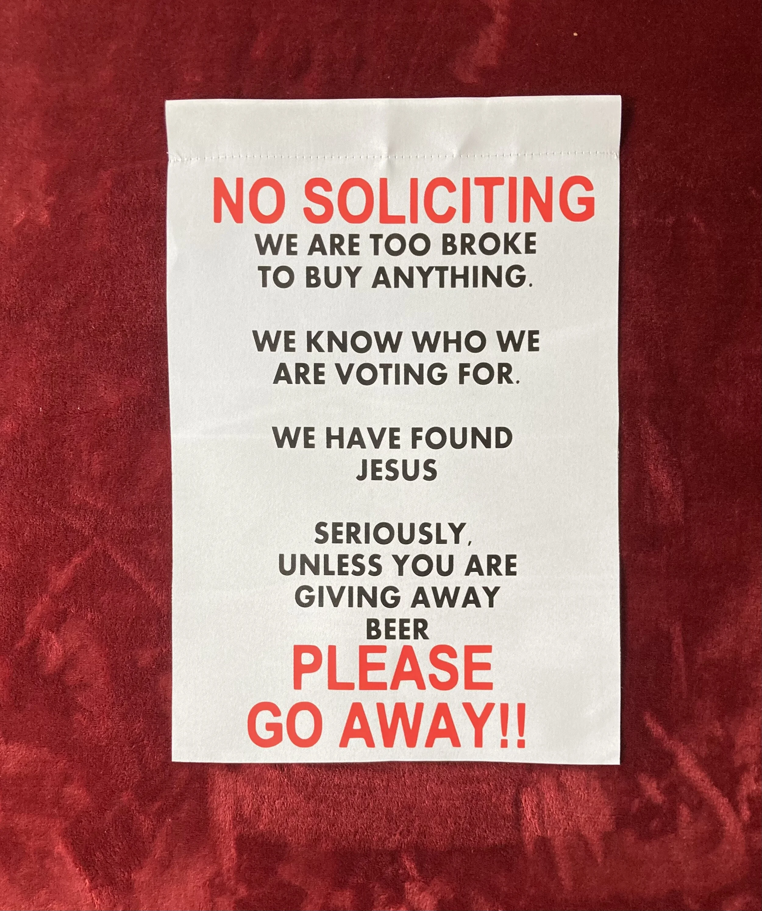 Make your garden, your porch and/or your front yard stand out with our pretty, unique, and funny No Soliciting. We Are to Boke To Buy Anything, We Know Who We Are Voting For, We Have Found Jesus, Seriously Unless You Are Giving Away Beer, PLEASE GO AWAY Garden/Yard Flag! The saying might be one of the all-time funniest welcome sign available! Which makes this Garden Flag perfect for display for your front door or porch!