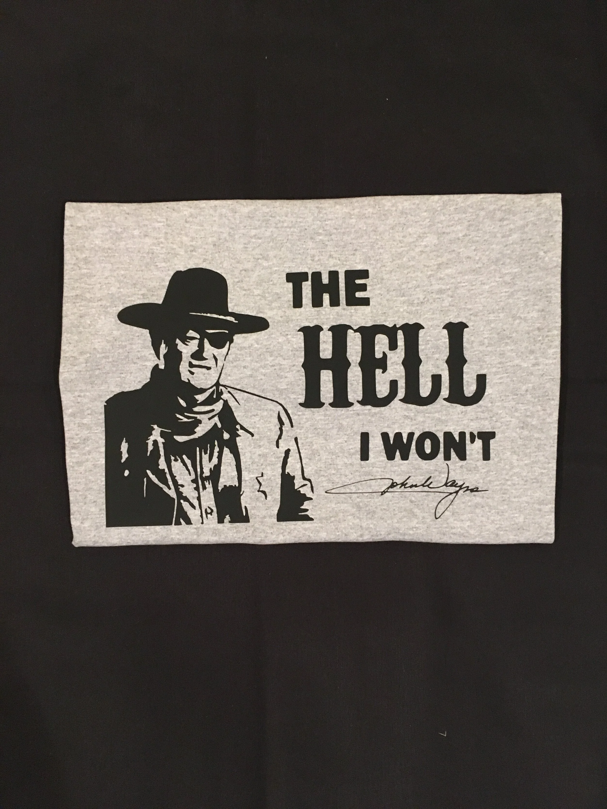 If you're a fan of John Wayne "The Duke", you need to check out “The Hell I Won’t” Unisex T-shirt. This legendary icon's image alone represents the patriotic American in you and you can't go wrong wearing this John Wayne "The Duke" t-shirt! This shirt is perfect for any "The Duke Old Western" fan! Make Sure to check out our John Wayne kitchen towel and thermal socks!