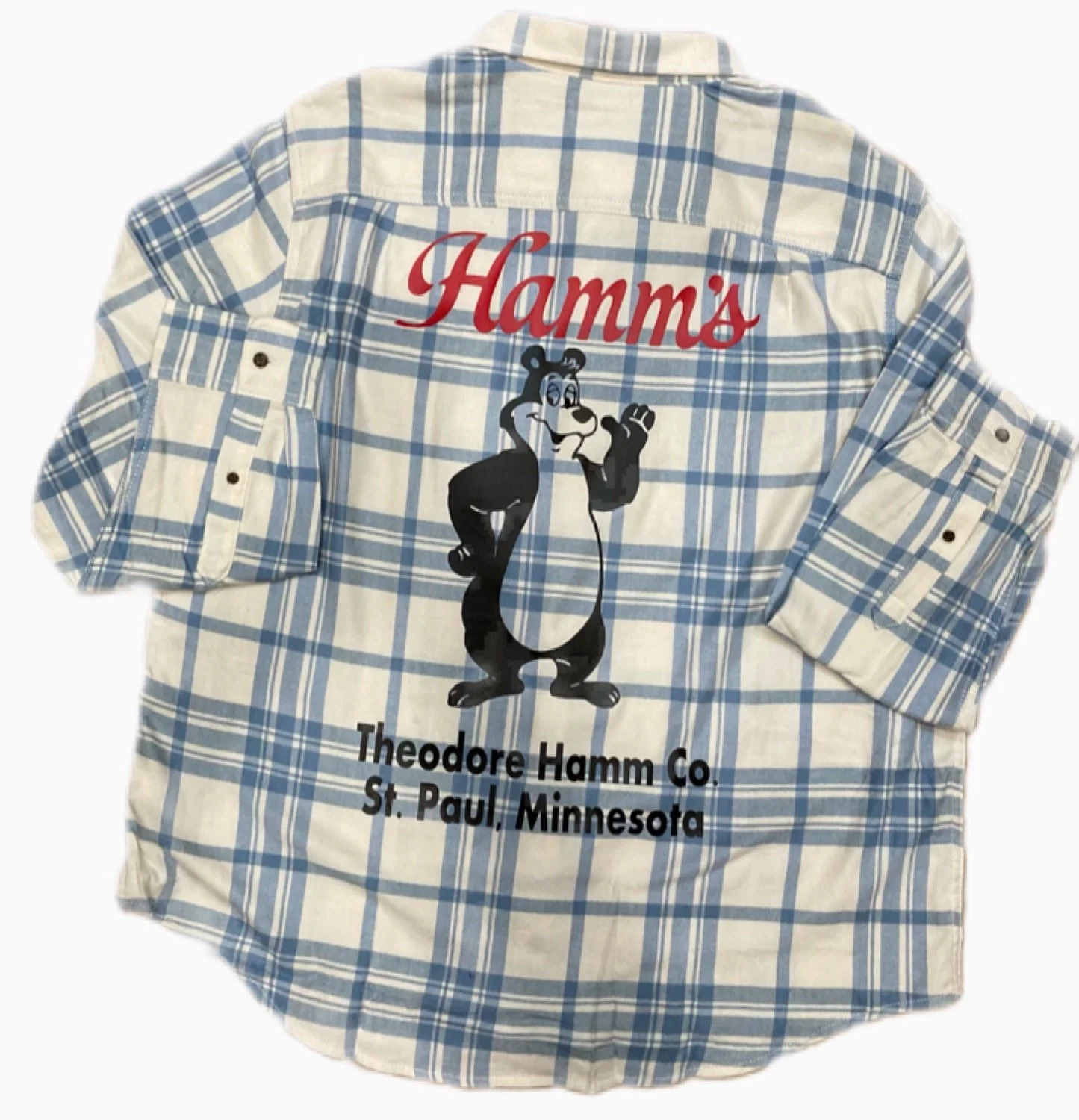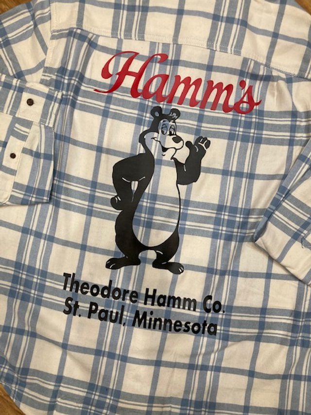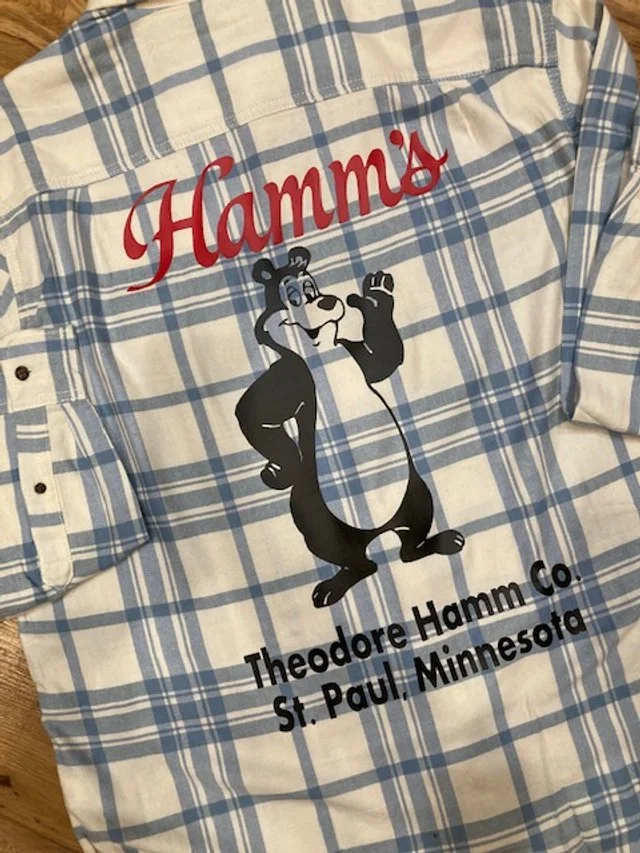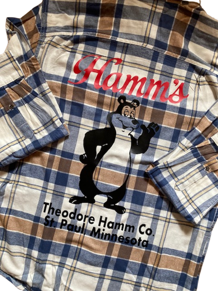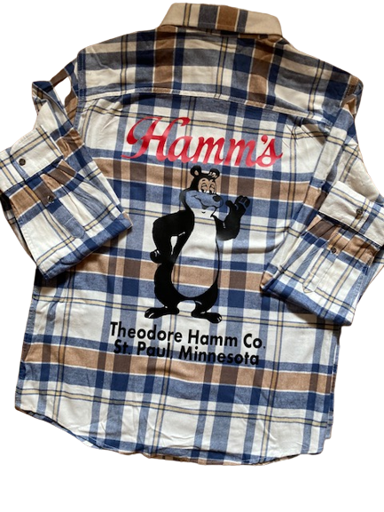 Welcome to the land of the of the sky blue waters the Theodore Hamm Company! This Hamm's Bear Flannel button down Shirt delivers handsome, versatile style starting with this flannel button up shirt in super soft fabric! The Hamm’s Beer Bear, Sascha, the mascot for Hamm’s Beer Flannel Shirt is perfect for the Hamm’s Beer Lover or the Hamm’s Beer Collector! Sascha was a cartoon mascot used in television production and print advertisements for Hamm’s beer. The animated character was the first of its kind in the beer industry which makes this soft flannel shirt perfect for the Hamm's Bear Fan!